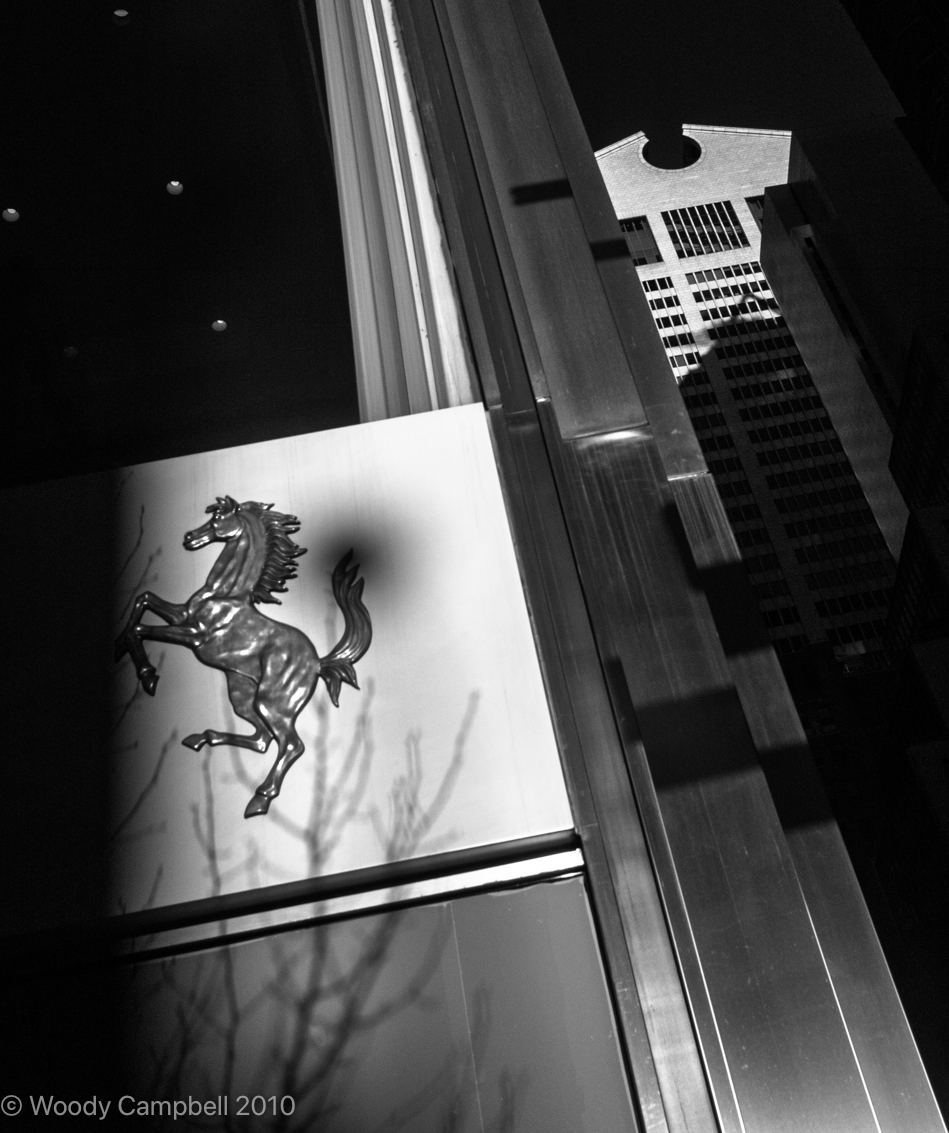 Looking back 16 years to looking up at the Ferarri dealership on Park Avenue. Shot in infrared.   The dealership is still there, as is the AT&T building in the background.   The AT&T Building is an elegant illustration of Parkinson’s Law of Buildings: perfection of a planned headquarters is achieved only by institutions on the point of collapse.