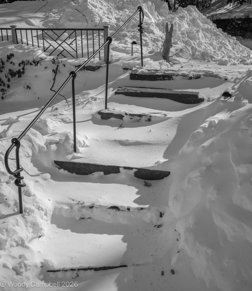WARREN CONNECTICUT – Here are our front steps, and our stone rabbit.  The steps are not really passable but we’re not expecting anyone so it’s ok.  Note the drift in the background.