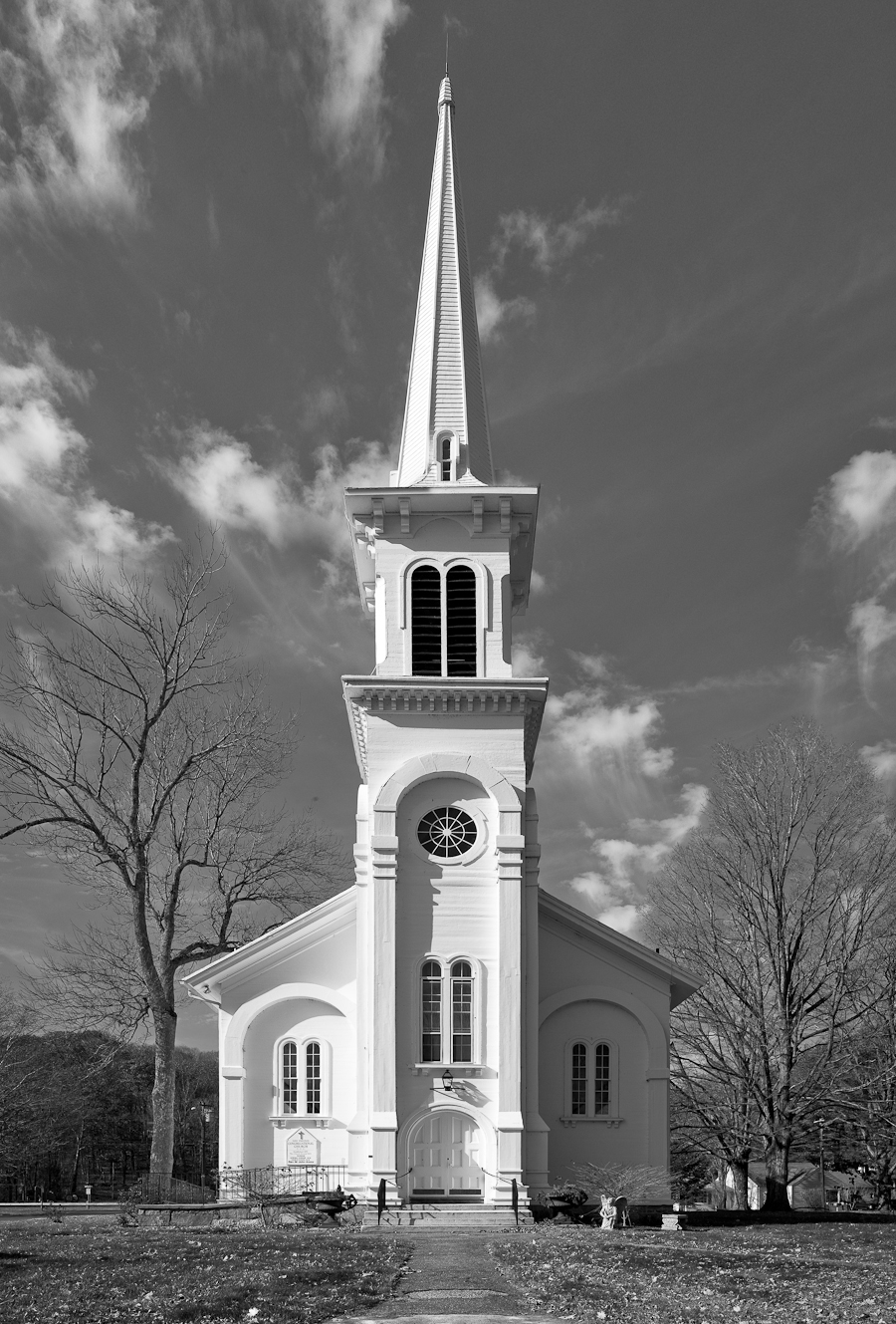 NEW PRESTON, CONNECTICUT – I’ve decided to photograph all of the churches in Litchfield County, Connecticut, very much working in the shadow of Walker Evans. The approach is frontal. You can see a similar esthetic in the “Small Town” images on my landscape gallery, and for that matter in 30 Rock taken on November 6. This is one of two Congregational churches in New Preston that serve the same parish (the other is the Stone Church). Captured at sunrise.