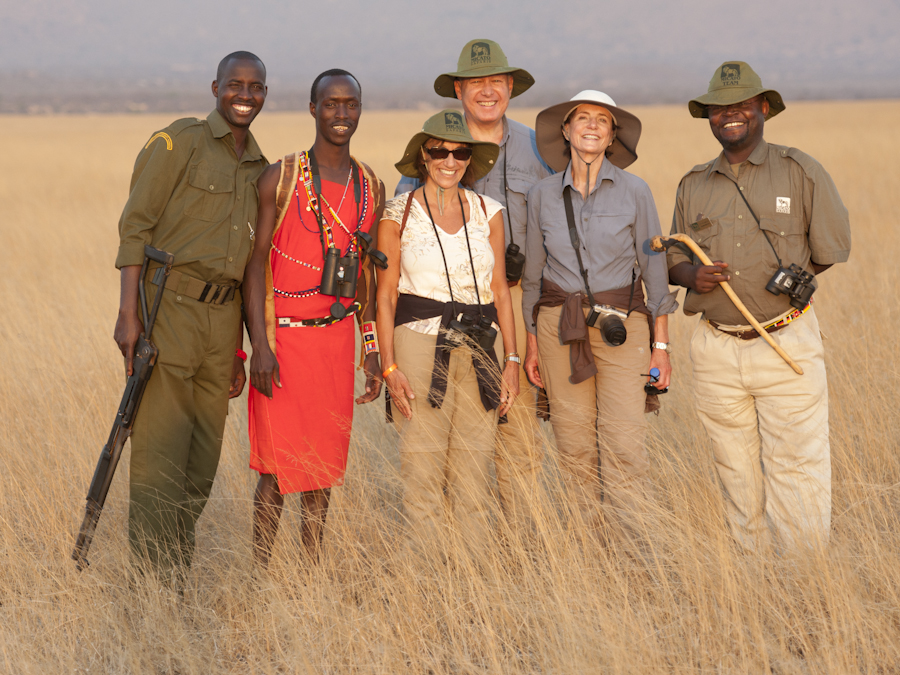 Here we are at sunset at the end of a bush walk. The man in red is a Maasai tracker; the man in green is armed in case of an unfortunate encounter with wildlife. In Ol Donyo Wuas’ experience this hasn’t been an issue but their view is better safe than sorry.