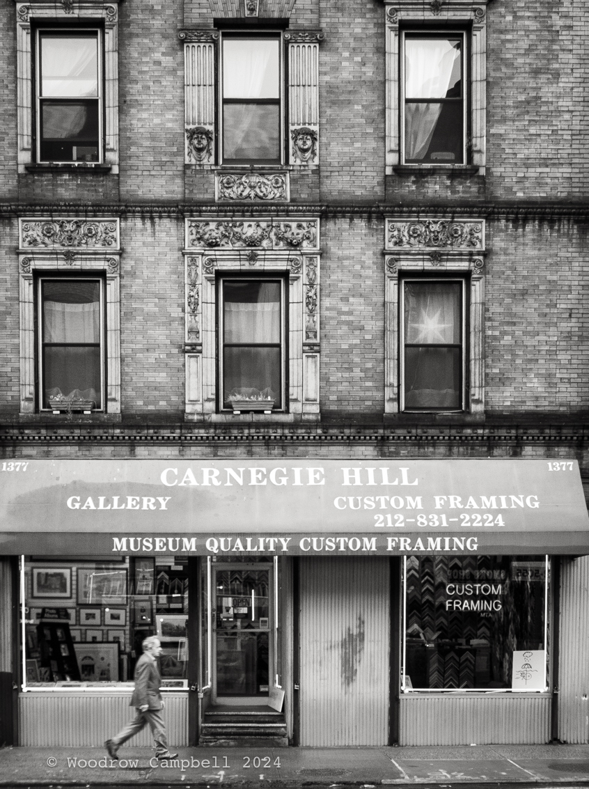 Looking back 13 years: a solitary figure strides past an ornate facade on Carnegie Hill, where the promise of “museum quality” frames contrasts with the quiet wear of urban life. Day 821 of one photograph every day for the rest of my life.