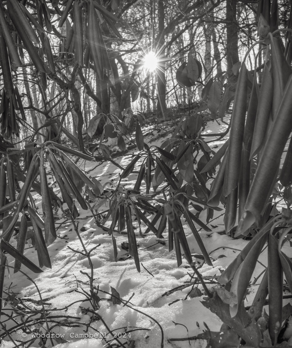 WARREN CONNECTICUT – It’s very cold here: the sun pierces the rhododendron’s cold-wilted leaves, casting fragile shadows on the snow, a fleeting triumph over winter. I’ve posted this after the fact as I have caught up with the image.