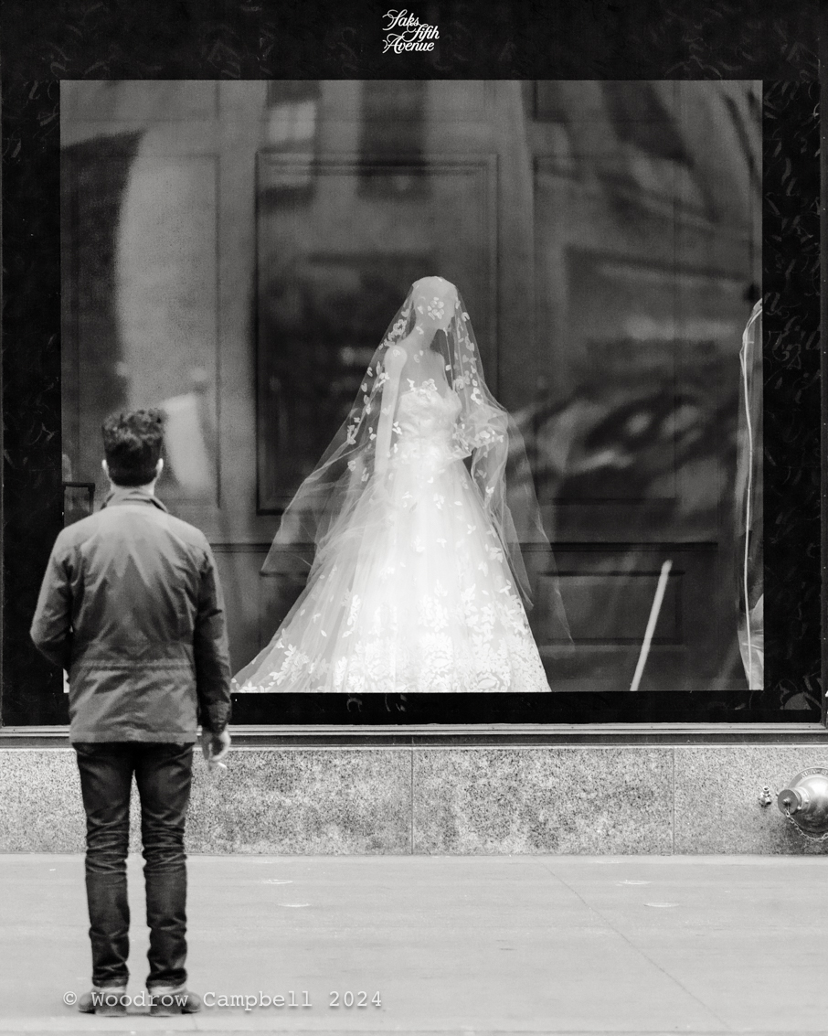 Looking back 15 years to Saks Fifth Avenue: January 15 is a day of store windows. Here a lone figure gazes at a bridal display; the reflection blurs the line between memory and aspiration. Day 94 of one photograph every day for the rest of my life.