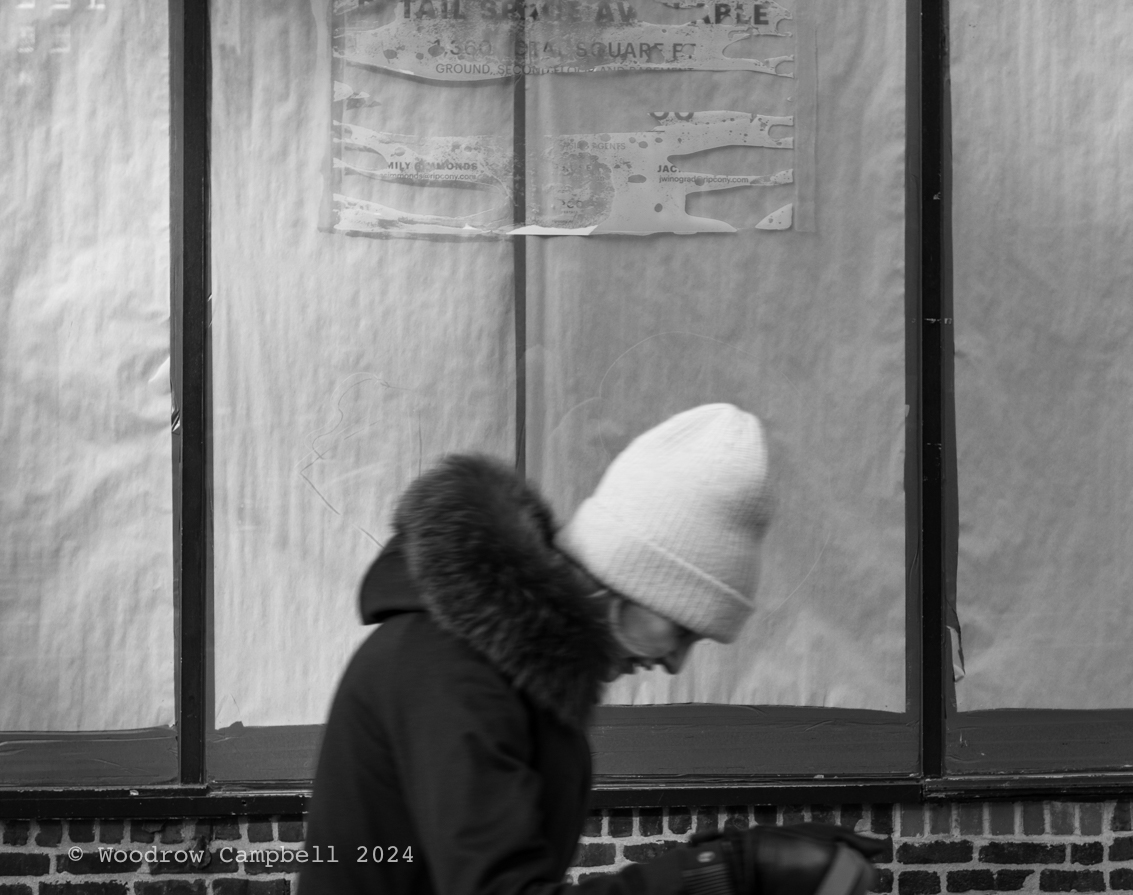 Manhattan – A silhouette passes a shuttered storefront; the blank windows echoes the City’s relentless churn of erasure and renewal.