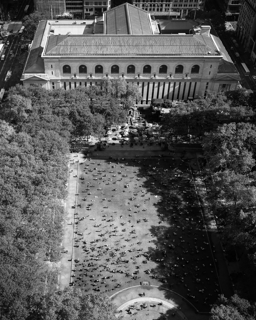 NEW YORK NEW YORK – I had some fun today. I rented a Phase One IQ260 Achromatic back. This is a 60 megapixel medium format back that is monochrome only and has very wide spectral response (which means that for non-scientific use it needs to be used with an IR-blocking filter in front of the lens). It came attached to a Phase One body with a 45mm moderate wide lens. The body and lens are made by Mamiya – competent but not my favorite. It took me an hour to sort the ergonomics (I’ve shot with this camera on a variety of occasions but not recently, and I’ve owned a Phase One back). I shot around Bryant Park, which is under construction at this point.