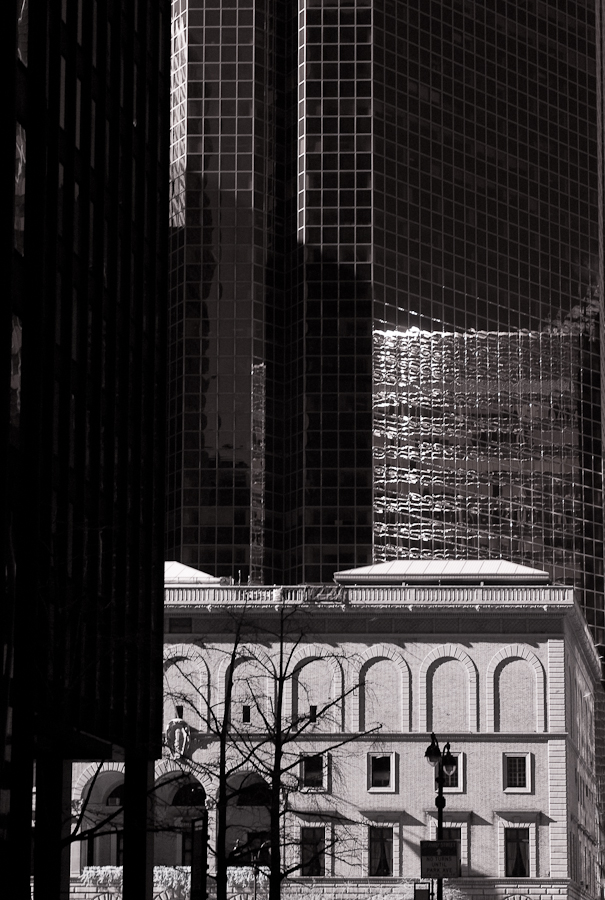 NEW YORK, NEW YORK – Fabulous late afternoon light in midtown, with light reflected from buildings adding nuance. I’m shooting with my backup Leica, and M8.2, because I left my M9 at Gary and Diana’s the previous evening (symptomatic of wine consumption). I had a number of good images to choose among. This is Mies van der Rohe’s iconic Seagram building – part of my effort to do a new take on iconic structures. I have an ongoing project on the Seagram building and the plaza formed by it and the Racquet and Tennis Club (McKim Mead and White) and Lever House to the northwest (the “Hello Kitty’s” come from there). Image taken with my M8.2 and a 90mm lens – three images stitched in Photoshop.