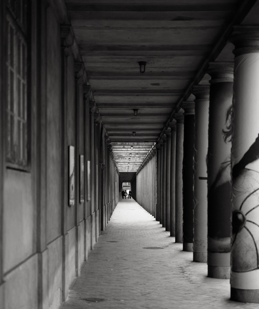 COPENHAGEN – Another dullish day. I went to Tivoli but found it less charming than I remembered, a bit tawdry actually. I’m sure that there’s a lot to photograph here but I’m not finding it. In my wanderings to and from I ended up taking a solo person and a colonnade, topics that I’ve covered endlessly for as long as I’ve been shooting (starting with my grand tour of Europe in the 1970s and most recently here yesterday and in Paris two days ago). I was in Tivoli then then so maybe the association triggered these images in the style of À la recherche du temps perdu. With my Leica Monocrom and 50mm Summicron Asph., three frames stitched in the case of the solo man.