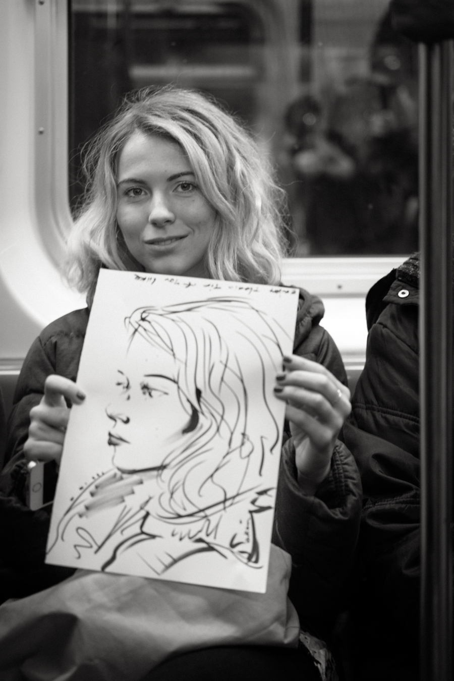 NEW YORK NEW YORK – On a walk in the East Village today I ran across a bit of fence that had painted strips on it so that if you line them up just right it made the face of a man. On the way home a subway artist sketched the pretty young woman sitting across from me. That it. October 22. In a nutshell.